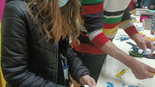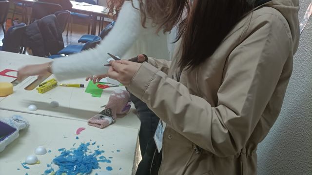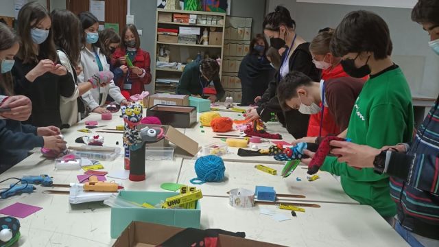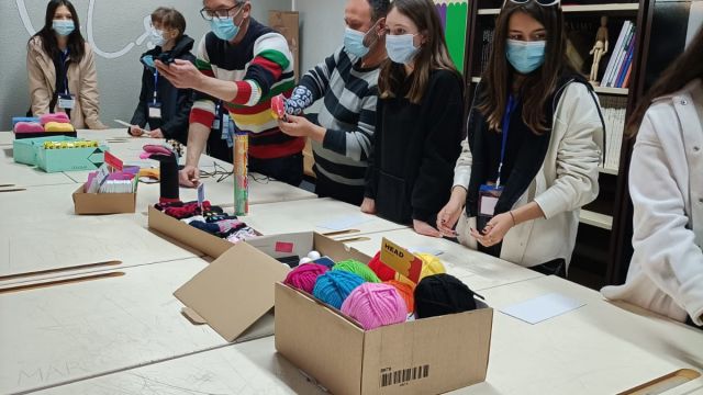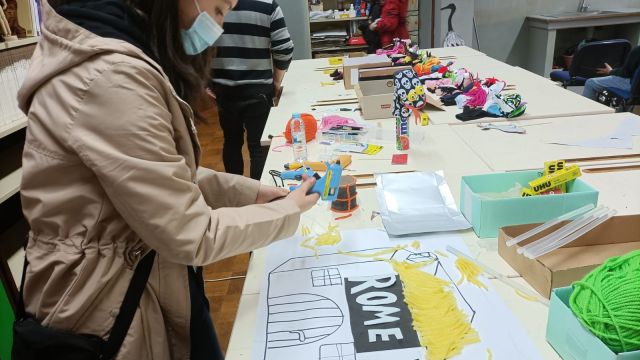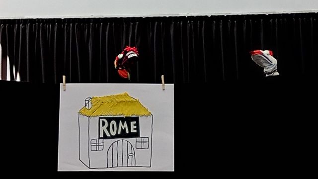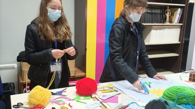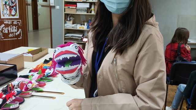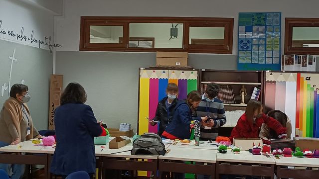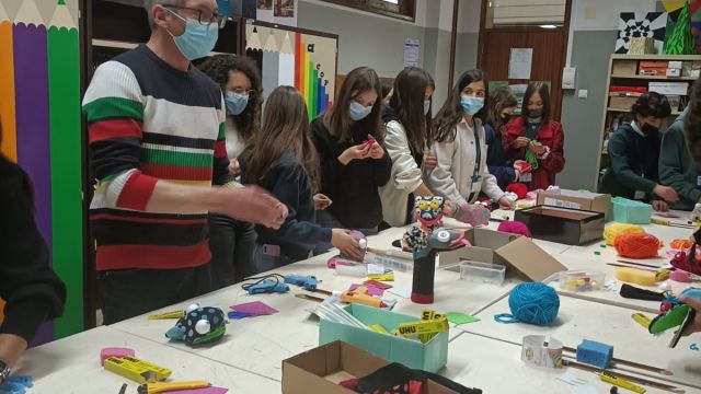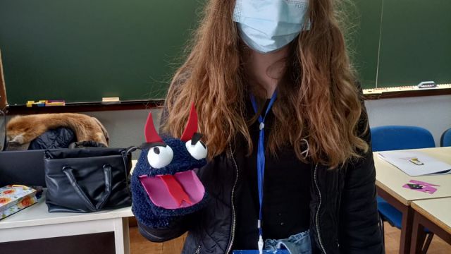 Okazało się, że szkoła w Amarelei jest oddalona od naszego hotelu wiele kilometrów i na miejsce będziemy codziennie dojeżdżać autobusem. Powitanie przez gospodarzy było bardzo serdeczne, z zainteresowaniem obejrzeliśmy szkołę. Jeszcze przed obiadem rozpoczęły się pierwsze zajęcia programowe: warsztaty integracyjne poprowadził aktor z teatru z Evory. W godzinach popołudniowych zaczęliśmy tworzyć kukiełki i rekwizyty do planowanego od kilku tygodni przedstawienia. Przygotowaliśmy postacie występujące w znanej balladzie Adama Mickiewicza, czyli pana Twardowskiego, diabła, panią Twardowską, uczestników biesiady w karczmie „Rzym”. Praca nad kukiełkami i scenografią bardzo się nam podobała.