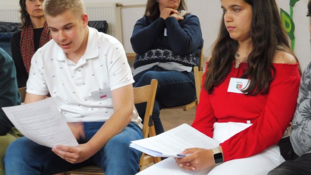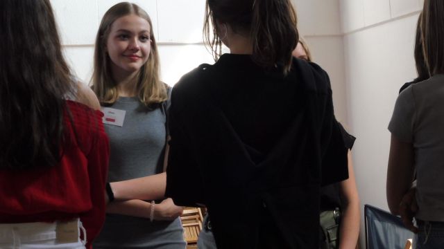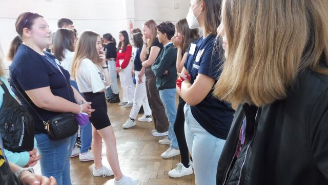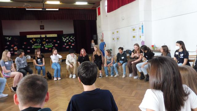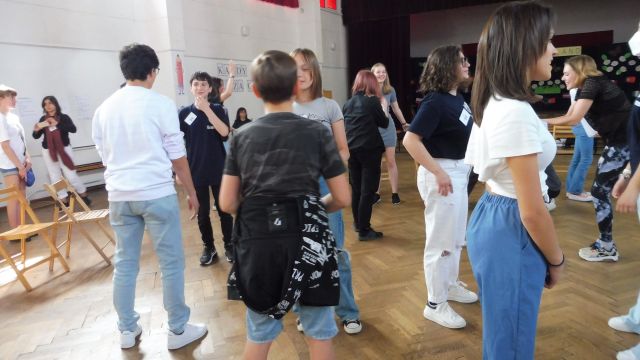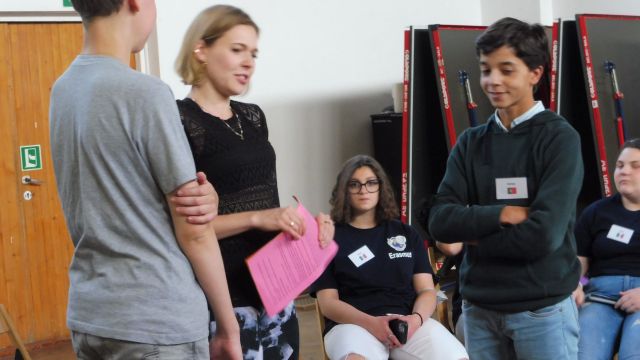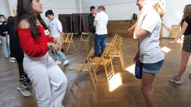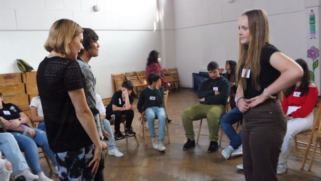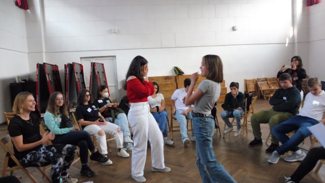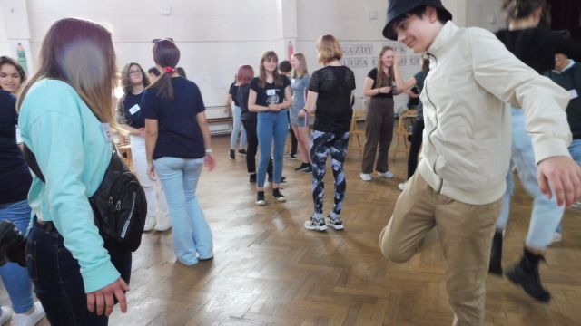 Po obiedzie spotkaliśmy się z Dagny Mikoś, aktorką Teatru im. Wandy Siemaszkowej w Rzeszowie, która przez wiele godzin w ciekawy i niekonwencjony sposób pokazała nam, jak profesjonaliści pracują, przygotowując się do roli teatralnej. Zasadnicza część warsztatów miała charakter ćwiczeń głosowych.