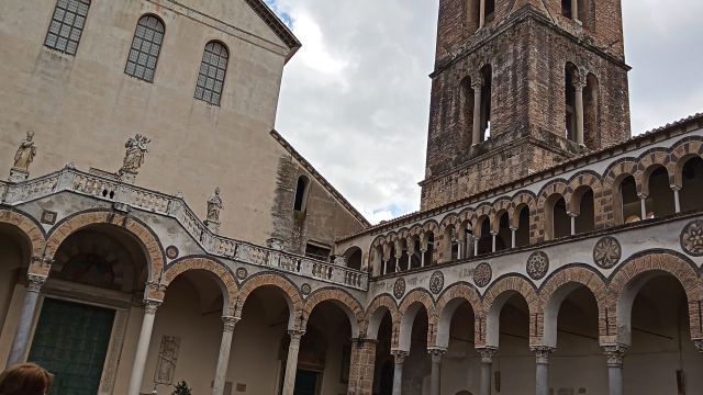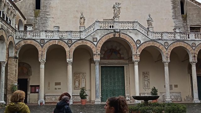 w wyjątkowy świat muzyki oraz przedstawienia scenicznego. Jeszcze wyraźniej rolę tę pełni, o czym przekonaliśmy się po chwili, wystrój widowni z bogatą sztukaterią i malowidłami na ścianach i suficie. Po wyjściu z centrum sztuki udaliśmy się do historycznej części Salerno, gdzie przy jednej z wąskich kamiennych uliczek wznosi się Katedra św. Mateusza, której początki sięgają XI w. To ważne miejsce dla mieszkańców miasta, gdyż w jednej z kaplic spoczywają szczątki patrona miasta i świątyni, czyli jednego z czterech Ewangelistów.